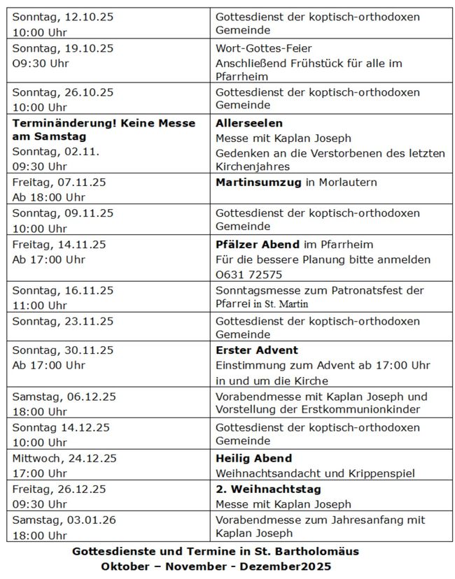 Gottesdienste und Termine in St. Bartholomäus Wichtige Information In Zukunft Vorabendmessen jeweils am Samstag vor dem ersten Sonntag des Monats um 18:00 Uhr. Hinweis: Die Vorabendmessen um 17:45 Uhr ...